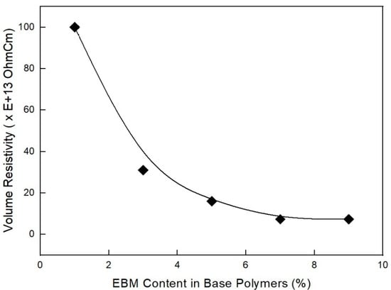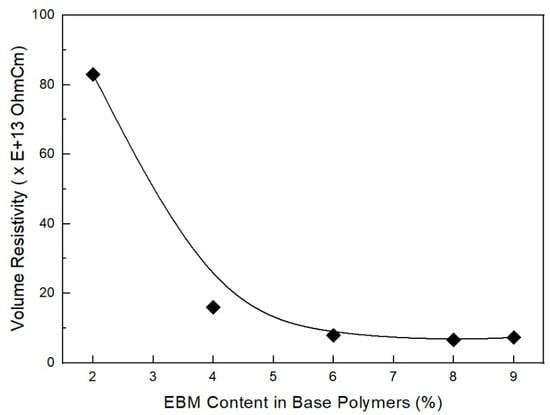 As shown in Figure 20, volume resistivity (Ωcm) decreased with increasing EBM content in the base polymers. These results are almost the same as in the previous study. That is, the electrical property decreased suddenly by a small amount of EBM. AP-731 (4% EBM content in base polymers) showed 1.6 × 1014 (Ωcm), while AP-730 (2% EBM content in base polymers) showed 8.3 × 1015 (Ωcm). However, in jacket formulations, a maximum of 9% EBM content in the base polymers can be applied. These findings align with previous studies’ results that a polymer’s electrical property depends on its size []. As a result, a larger size yields low electrical properties. Thus, the electrical properties decreased when the size/volume was small. However, when the size was large, the electrical properties were high. As a result, a small-sized polymer will have a low electrical property—specifically electrical resistivity—while a large-sized polymer will display higher volume resistivity []. The findings indicate that the polymer’s electric resistivity depends on the film’s thickness []. The thickness and size become important when selecting a polymer because of its electric volume resistivity. Volume resistivity is an electrical insulation property.