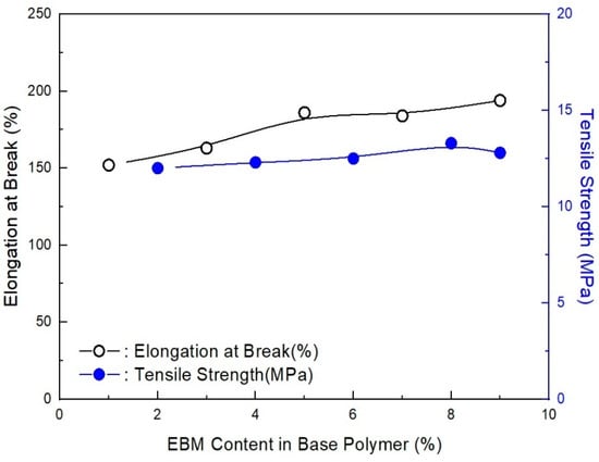 It is considered that EXACT 8201 acts as an intermediate material between EVA/CLNA-8400 and EBM/120 phr MH. If EXACT 8201 does not cooperate with these materials, tensile strength may decrease with EXACT 8201 content. From these results, a 10% content of EXACT 8201 in the base polymer can be used in EVA/CLNA-8400/EBM/120 phr flame-retardant (MH) formulations (Figure S2).