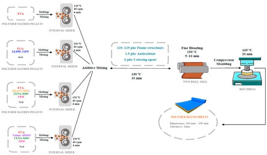 Then, the rest of the additives, including the flame retardants (120–125 phr), antioxidant (1.5 phr), and coloring agent (6 phr), were mixed with matrix polymers for 10 min at 150 °C. The premixed compounds were moved to a two-roll mill (Brabender Co., Duisburg, Germany) for fine blending. The temperature of the two-roll mixer was kept around 150 °C, and the mixture was processed for 5–10 min. The mixture was moved to a hot press and compressed at 165 °C for 20 min. Sheets of the test specimens were prepared with dimensions of 110 × 185 mm and a thickness of 2 mm. Figure 21 shows a schematic diagram of the preparation method of the composites.