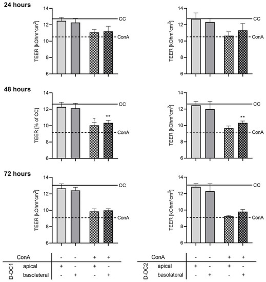 Effects of D-DC1 and D-DC2 extracts (applied at 150 µg/mL) on the co-culture model of the piglet gut, with apical or basolateral application and with or without ConA-stimulation. TEER [kOhm*cm2] was observed over a 72 h period. Absolute TEER values are shown compared with the unstimulated CC (solid line). Effects of extracts D-DC1 (on the left) and D-DC2 (on the right) without ConA-stimulation were compared statistically with the unstimulated CC. Effects of the extracts in the presence of ConA-stimulation were compared statistically with the ConA-stimulated control (dashed line, ConA). Bars and error bars represent the means and standard deviations of 4 independent experiments (n = 4). Significant differences are indicated by asterisks ** p < 0.01, T trend, p < 0.1).