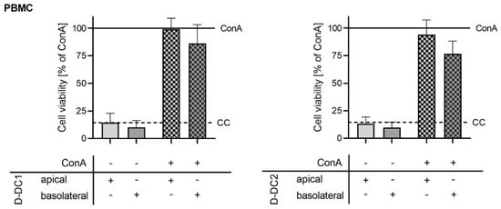 Effects of D-DC1 (left) and D-DC2 (right) extracts (150 µg/mL) on the viability of PBMC in the co-culture model. The viability of PBMC was determined after the conclusion of barrier integrity tests, 72 h after the application of stimuli and treatments. Bars and error bars represent the means and standard deviations of 4 independent trials (n = 4). Effects of extracts D-DC1 (on the left) and D-DC2 (on the right) without ConA-stimulation were compared statistically with the unstimulated CC (dashed line). Effects of the extracts in the presence of ConA-stimulation were compared statistically with the ConA-stimulated control (solid line, ConA), as a measure of a fully activated, stimulated PBMC population (100%).