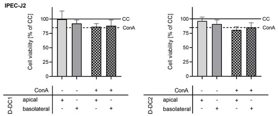 Effects of D-DC1 (left) and D-DC2 (right) extracts (150 µg/mL) on the viability of IPEC-J2 in the co-culture model. The viability of IPEC-J2 was determined after barrier integrity tests, 72 h after the application of stimuli and treatments, by Neutral Red (NR) test. Bars and error bars represent the means and standard deviations of 4 independent trials (n = 4). Effects of extracts D-DC1 (on the left) and D-DC2 (on the right) without ConA-stimulation were compared statistically with the unstimulated CC (solid line, 100%). Effects of the extracts in the presence of ConA-stimulation were compared statistically with the ConA-stimulated control (dashed line, ConA).
