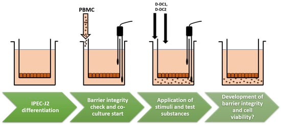 Based on the co-culture model of the piglet gut described by Schott et al. [40], IPEC-J2 were seeded in 12-well plates with transwell inserts (Corning Inc.), i.e., in the “apical” inner compartment of the inserts at a seeding density of 1 × 105 cells/well. Cells were allowed to grow and differentiate for seven days, with media change in apical and basolateral compartments every second day (see model schematic in Figure 4). At the end of the differentiation phase, confluent growth in the inserts was checked microscopically and intestinal epithelial barrier integrity was assessed using TEER [kOhm*cm2] measurement. TEER was measured with a volt-/ohmmeter (Millicell ERS, Millipore, Burlington, USA) and an adjustable electrode set (MERSSTX03 Millicell ERS Adjustable Electrode Set, Millipore) under sterile conditions (schematic, Figure 4). Upon reaching a minimum TEER of 6 kOhm*cm2 on the eighth day after seeding IPEC-J2, the medium was changed from IPEC-J2 cultivation medium to PBMC cultivation medium, and PBMC were seeded to the basolateral compartment at a seeding density of 3*106 cells/well. Plates were further incubated at 39 °C and 10% CO2 for 24 h prior to the application of stimulus and treatments to the test wells. Barrier integrity was checked every 24 h after stimulus application (t = 24, 48, and 72 h) and cell viability was assessed following the last measurement. For evaluation, absolute TEER values were assessed statistically, and relative TEER values were calculated using the CC or ConA control groups as reference points (=100%). A total of four separate trials were carried out, each consisting of two trial plates seeded with cells originating from the same culture. Treatments were performed in duplicates on two plates originating from the same culture flask for each independent trial. For co-cultivation, PBMC isolated from the blood of different pigs were used, avoiding cross-contamination and mixing of different PBMC populations.