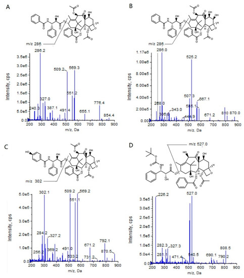 Product ion mass spectra of PTX (A), 6α-OHP (B), 3′-OHP (C), and DTX (D).