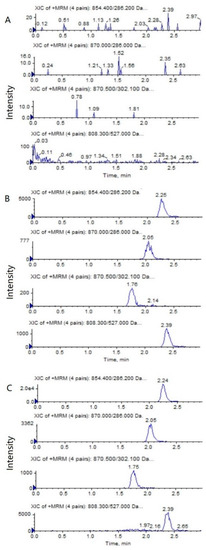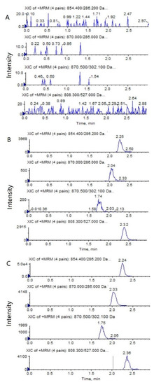Representative MRM chromatograms of PTX (m/z 854.4→286.2), 6α-OHP (m/z 870.0→286.0), 3′-OHP (m/z 870.0→302.1), and DTX (m/z 808.5→527.0) in mouse plasma: (A) a blank mouse plasma sample; (B) plasma samples spiked with PTX (0.5 ng/mL), 6α-OHP (0.25 ng/mL), 3′-OHP (0.25 ng/mL), and the internal standard; (C) a mouse plasma sample following the intravenous injection of PTX solution at 5 mg/kg.