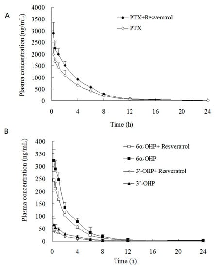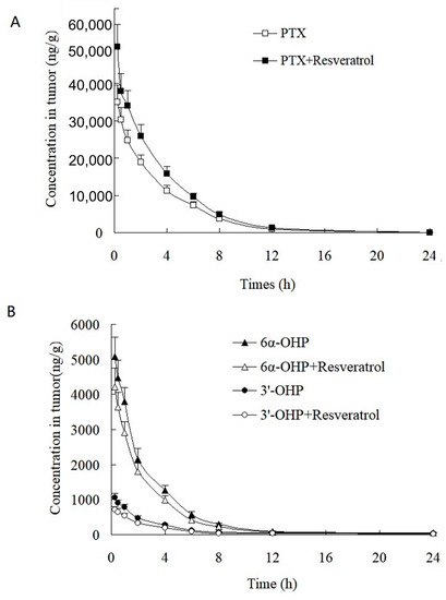 This validated method was successfully applied to the study of the PK and tumor tissue distribution in post xenograft nude mice injected with PTX solution. The plasma concentration–time profiles of PTX, 6α-OHP, and 3′-OHP are shown in Figure 4 after the injection of PTX solution in the presence or absence of resveratrol, and the PK parameters are provided in Table 4 and Table 5. The oral administration of resveratrol for five days significantly (p < 0.05) increased the AUC of PTX by 30.1% and decreased the total plasma clearance (Clt) of PTX by 27.7%. Other parameters were not significantly altered, such as the elimination rate constant (k) and the terminal half-life (t1/2). Accordingly, the AUC of 6α-OHP and 3′-OHP in the presence of resveratrol was significantly lower when compared with AUC in the absence of resveratrol. Therefore, resveratrol could inhibit the metabolism of PTX and decreased the formation of 6α-OHP and 3′-OHP. Furthermore, the concentration of PTX, 6α-OHP, and 3′-OHP in the tumor tissue displayed a similar tendency to that of PTX, 6α-OHP, and 3′-OHP in the plasma (Figure 5) [12,13].