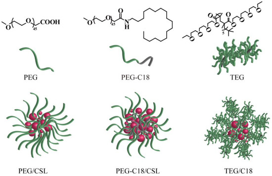 The DLCs of these CSL nanoparticles were determined via HPLC. All the nanocarriers presented moderate to good encapsulated efficacy, and the DLCs were 77.8%, 87.3%, and 68.5% for PEG/CSL, PEG-C18/CSL, and TEG/CSL, respectively (Table 1). The relevant encapsulate efficiencies (EE) where it was considered that CSL NPs presented “core-shell” structure, in which CSL was encapsulated by nanocarriers to form the hydrophobic core, meanwhile, the hydrophilic portion of nanocarriers dispersed on the outer of nanoparticles to contribute to the hydrophilicity. During the assembly process, a DLC would be affected by the hydrophobic interactions and steric hindrance. PEG and PEG-C18 revealed a similar degree of entrapped efficacy, which was better than that of TEG. This phenomenon could be attributed to the different degrees of steric hindrance; PEG and PEG-C18 have flexible linear chains and, therefore, low steric hindrance. Although the structure of TEG is also a linear chain, many tri(ethylene glycol) compounds exist as side chains around the main chain, thus enhancing steric hindrance and reducing the space capacity of the nanocarriers, which induced low drug-loading capacity [26]. Moreover, PEG-C18 presented higher entrapped efficacy than PEG, because PEG-C18 presented more hydrophobicity than PEG. C18 aliphatic chains in PEG-C18 enhance the hydrophobicity of nanocarriers, which results in stronger hydrophobic interactions between PEG-C18 and CSL. The enhanced drug-loading capacity of PEG-C18 is shown in Table 1.