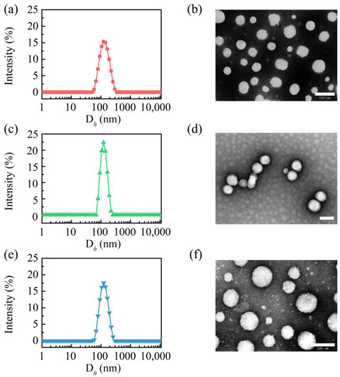 Particle size distribution curves of PEG/CSL (a), PEG-C18/CSL (c), TEG/CSL (e), and TEM images of PEG/CSL (b), PEG-C18/CSL (d), and TEG/CSL (f). Scale bar: 100 nm.