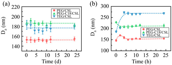 The media stabilities were also assessed. The CSL nanoparticles were added in PBS (pH 7.4), 5% glucose solution, 0.9% solution, and plasma. All the CSL nanoparticles presented good levels of stability in PBS (pH 7.4), 5% glucose solution, and plasma. After mixing with the 5% glucose solution, the particle sizes slightly increased, which were approximately 155, 175, and 185 nm for PEG/CSL, TEG/CSL, and PEG-C18/CSL, respectively. During the subsequent 24 h, the particle sizes were maintained, and no significant change was observed during the incubation period (Figure 4a). A similar phenomenon occurred when the CSL nanoparticles were incubated with plasma: The particle sizes of these nanoparticles slightly fluctuated within the initial 4 h and then maintained a constant in the following 20 h (Figure 4b). This phenomenon may be attributed to the interactions between nanoparticles and plasma proteins [27,28]. It was reported that nanoparticles might be regulated by plasma proteins after entering a physiological environment, which could bind the surfaces of the nanoparticles to form the protein crown. The CSL nanoparticles interacted with plasma proteins to form nanoparticle–protein complexes within the initial 4 h, resulting in the fluctuation in the particle size; the complexes were stable in the subsequent incubation time, and the particle sizes were maintained.