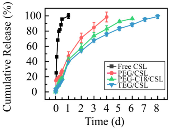 To determine the release profiles, the dialysis membrane method was used with PBS (pH 7.4) as the release medium to mimic the release process in a physiological environment. The free CSL under the same conditions was used as the control (Figure 5). The free CSL (the CSL DMSO solution) presented a fast release rate, as it was completely released in 12 h. CSL nanoparticles exhibited sustaining release profiles, and their release process ranged from 4 to 8 days. Compared with the free CSL, the CSL nanoparticles revealed slow release rates, which may be attributed to the core–shell structure of the CSL nanoparticles, consistent with previous reports [29,30].