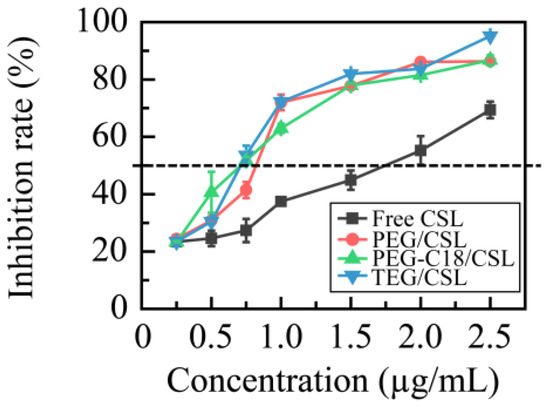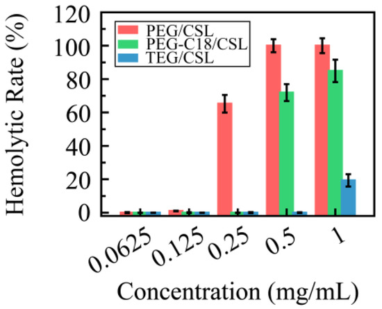 Based on our previous study, it was found that the CSL has severe membrane toxicity in red blood cells. To verify their levels of membrane toxicity, these CSL nanoparticles were incubated with red blood cell suspension for 4 h and detected with an Elisa reader, and their hemolytic rates are shown in Figure 7. Compared with the free CSL, the hemolytic rates of the CSL NPs were improved, which can be explained by the “core–shell” structure of the nanoparticles. After entrapping the CSL molecules into the core, the nanocarriers form the hydrophilic shell, through which they avoid or decrease the interactions between the CSL molecules and the erythrocyte membrane. Moreover, the hemolytic rates of all three CSL nanoparticles depended on the CSL concentration; no hemolysis was shown when the concentration was below 0.125 mg/mL CLS, while with a further increase in the concentration, these three CSL nanoparticles presented different hemolytic rates. PEG/CSL and PEG-C18 CSL revealed significant levels of membrane toxicity when the concentrations were 0.25 and 0.50 mg/mL, respectively, and the hemolytic rate exceeded 60%. For TEG/CSL, although membrane toxicity was observed when the concentration was 1.00 mg/mL, the hemolytic rate was below 20%. These results were consistent with those found for the cumulative release. A low release rate presented less opportunity for the free CSL molecules to interact with the red blood cell membrane, thus leading to a low hemolytic rate.