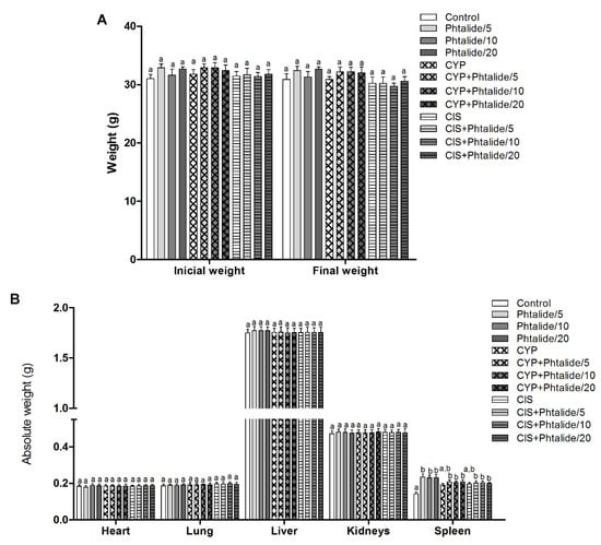 Biometric parameters of mice treated with Phthalide 1. (A) Initial and final weight; (B) Absolute organ weight: Heart, lung, kidneys, liver, and spleen. Legend: g: Gram; CYP: Cyclophosphamide; CIS: Cisplatin; Phthalide 1: 3-heptylidene-4,6-dimethoxy-3H-isobenzofuran-1-one; Phthalide 1/5–5 mg/kg; Phthalide 1/10–10 mg/kg; Phthalide 1/20–20 mg/kg. Results are presented as mean ± SEM. Different letters indicate statistically significant differences (Statistical test: ANOVA/Tukey, p < 0.05).