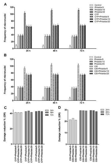 Frequency of micronuclei and percentage of damage reduction in different experimental groups. (A) Genotoxicity assessment: Chromosomal lesions in the compounds tested with 1 and 1 associated with cyclophosphamide; (B) Genotoxicity assessment: Chromosomal lesions in the compounds tested with 1 and 1 associated with cisplatin; (C) Percentage of damage reduction of 1 associated with cyclophosphamide; (D) Percentage of 1 damage reduction associated with cisplatin. Legend: g: Gram; CYP: Cyclophosphamide; CIS: Cisplatin; Phthalide 1: 3-heptylidene-4,6-dimethoxy-3H-isobenzofuran-1-one; 1/5–5 mg/Kg; 1/10–10 mg/Kg; 1/20–20 mg/Kg. Results are presented as mean ± SEM. Different letters indicate statistically significant differences (Statistical test: ANOVA/Tukey, p < 0.05).