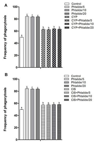 Phthalide 1, in combination with cyclophosphamide and cisplatin, did not increase the frequency of phagocytosis. This fact was already expected since the association of 1 with chemotherapy agents had a chemopreventive effect, reducing the induction of DNA damage. Regarding this fact, it only reduces the frequency of circulating micronucleated cells and reduces splenic activity. As previously reported, the spleen sequesters cells with DNA damage, for example [5,12,13,14,15].