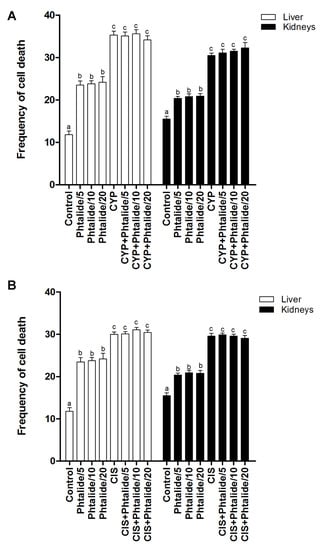 The cell death assay indicated that cyclophosphamide and cisplatin increased (p < 0.05) the frequency of cell death in the liver and kidney. Cyclophosphamide increased the frequency in the liver and kidney by 2.99× and 1.97×, respectively (Figure 5A). Cisplatin increased by 2.54× and 1.91× for the same organs, respectively (Figure 5B).