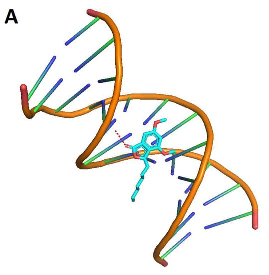The synthetic B-DNA Dodecamer crystallized structure was obtained through the RSCB PDB under code 1BNA. https://www.rcsb.org/structure/1BNA (accessed on 10 May 2022). Then, docking simulations were performed for each inhibitor candidate on the corresponding target. This procedure was performed using the HDOCK webserver [47]. Thus, the Docking score was evaluated.