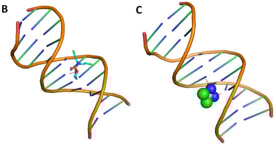 Interactions between the compounds (red dots) and B-DNA: 1 (A), cyclophosphamide (B), and cisplatin (C).