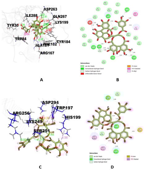 Casuarinin binding interactions were examined using the Discovery Studio (DS) visualizer (Figure 1A–H) and were found to have six hydrogen bonds with Tyr(A):35, Arg(A): 167, Phe(A): 182, Tyr(A): 184, Asp(A): 263, Gln(A): 267 residues of 4YAY protein (Figure 1A&B), three hydrogen bonds with Lys(A): 249, Ser(A): 251, Arg(A): 256 residues of 4DLI protein (Figure 1C&D), three hydrogen bonds with Asn(A): 567, Arg(A): 571, Glu(A): 719 residues of 1HW9 protein (Figure 1E&F) and two hydrogen bonds with Ala(A): 92, and Asp(A): 112 residues of 1B09 protein (Figure 1G&H).