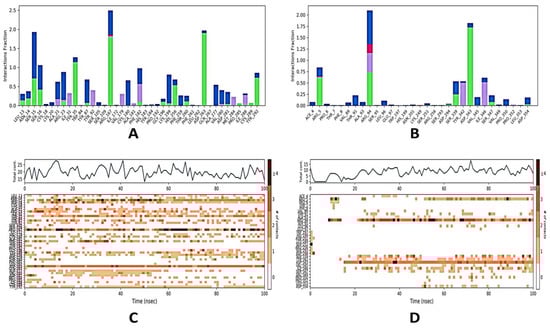Figure 5 represents how the ligand behaved while interacting with the target proteins during MD simulation for 100 ns. Protein interactions with the ligand can be monitored throughout the simulation. These interactions can be categorized by type and summarized, in Figure 5A for the casuarinin-4YAY complex, Figure 5B for the casuarinin-4DLI complex, Figure 5E for casuarinin-1HW9 complex, and Figure 5F for the casuarinin-1B09 complex. There are four types of protein–ligand interactions: hydrogen bonds, hydrophobic interactions, ionic interactions, and water bridges. Every connection type contains more explicit subtypes, which can be investigated through the “simulation interactions diagram” board. The stacked bar outlines are consistent throughout the direction; for example, an estimate of 0.8 suggests that collaboration be maintained for 80% of the simulation time. Qualities greater than 1.0 are possible because some protein aggregates may make multiple contacts of the same subtype with the ligand. A timetable portrayal of the associations and contacts (hydrogen bonds, hydrophobic, ionic, water spans) is shown in Figure 5C for the casuarinin-4YAYcomplex, Figure 5D for the casuarinin-4DLI complex, Figure 5 for the casuarinin-1HW9 complex, and Figure 5H for the casuarinin-1B09 complex. These figures depict which deposits communicate with the ligand in every direction. A few residues make more than one explicit contact with the ligand, which is shown by a hazier shade of orange, as indicated by the scale on one side of the plot. These plots are very crucial, suggesting the interaction of casuarinin with amino acids of target proteins throughout the simulation and that these ligands are not dissociating away from their interacting site; however, slight variations in the RMSD and RMSF values of the ligand, as showed in Figure 2 and Figure 3 respectively, suggest that these ligands may be reorienting themselves during the simulation.