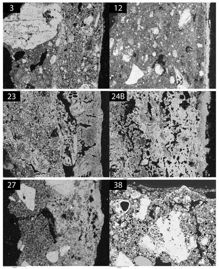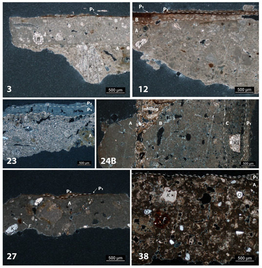 POM and SEM analyses were performed on a selection of samples (3, 12, 23, 24B, 27, 38) in which it was possible to recognize the plaster stratigraphy.