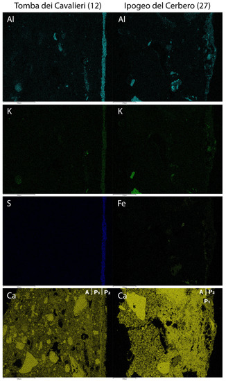 SEM-EDS analysis showed that the layer A is a mixture of lime putty and some clayey sediment (Figure 2). The film P1 is red puro fresco (goethite) applied on layer A. Layer P2 is a painted layer of about 100 µm thick on film P1 and shows the following mean chemical composition: CaO = 35% wt.; SO3 = 25% wt.; Al2O3 = 25% wt.; SiO2 = 8% wt.; K2O = 4% wt., which points to a mixture of lime and K-alum with charcoal.