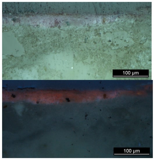 OM photomicrographs of cross sections under white (above) and UV-light (below) illumination of sample 1 (pink) of the tomba della Nike showing the strong pink-orange-coloured luminescence typically seen under ultraviolet wavelength for lake pigments.