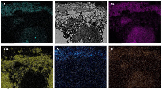 As for the pink paint layer, X-ray maps (Figure 7) and EDS analyses (Table 3) show a Ca-poor outer domain, characterised by the homogeneous distribution of Al, Si, K and S, pointing to the deliberate addition of potash alum (Al2(SO4)3K2SO4·12H2O) for the preparation of pigments and clay as filler [44,45,46,47].