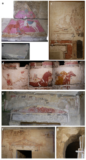 Sampling areas: Tomba della Nike pediment (a), wall band with spirals (b); Ipogeo Sant’Aloia (c); Tomba dei Cavalieri (d); Ipogeo Scocchera B (e); Ipogeo del Cerbero (f,g). Images used by permission of Soprintendenza Archeologia, Belle Arti e Paesaggio per le Province di BAT e FG (a,b,d–g) and Direzione Regionale Musei Puglia-Ministero della Cultura (c).
