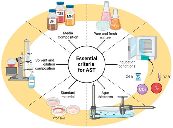 Key considerations to assess Antibacterial Susceptibility Tests (AST) in natural compounds; BHI: Bain heart infusion, TBS: Tryptic soy broth, MH: Mueller Hinton, ATCC: American Type Culture Collection, DMSO: Dimethyl sulfoxide.