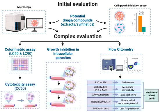In the search for novel antimicrobials and antiparasitic drugs, the first screening of all candidate compounds and extracts is usually assessed by a range of classic and standardized assays [93]. More complex evaluations can further assess the test compounds with the best potential (Figure 3). In clinical samples, microscopic examination is the gold standard for unicellular parasite identification [94]. As a result of its simplicity, microscopy can offer preliminary data regarding morphological alterations in parasitic cells after applying the potential antiparasitic compound in the culture. Death by apoptosis can be characterized by a shrinkage of the cell or loss of cellular volume [95]. In necrotic cell death, the parasites could undergo cytolysis, which can be visualized as small fragments or cell debris [96].