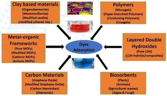 This review article mainly focused on six different materials: polymers, carbon-based materials, clay-based materials, metal–organic framework (MOF) materials, layered double hydroxide (LDH) materials, and biosorbents for the adsorption of dyes. We elaborated on each in detail, as shown in Figure 2. In adsorption, a pristine material is needed in which different functional groups are available for the adsorption of dyes. Other factors, such as porosity, temperature, pH, etc., are also responsible for the efficient adsorption of dyes.