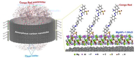Carbon-based materials are valuable candidates for the adsorption of dyes, metal ions and various antibiotics due to their large surface area, thermal and mechanical stability, and multiple functionalities in their network. In the previous decade, the adaptation of new carbon materials, such as diamonds, carbon nanotubes (CN), carbon dots, and graphene oxide (GO) have been shown to be valuable materials for adsorption studies [54]. GO is a 2D material with multiple oxygen moieties in its network that is mainly used for the selective adsorption of cationic dyes. GO can adsorb methylene blue (MB) quickly from a mixture of methylene blue (MB) and methyl orange (MO). The selectivity was explained by an ab initio method, where it was found that MB adsorption energy on GO was higher in comparison with MO (−2.25 vs. −1.45 eV), which confirmed much stronger adsorption of MB on a GO sheet than MO [55]. For more adsorption of dyes, different kinds of doped composites were designed by the researchers, showing better adsorption efficiency than pure GO-based material. Acrylic acid doped on GO can adsorb 100% MB at the expense of 10% MO [56].