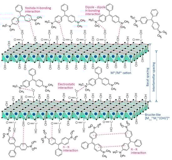 Layered Double Hydroxides (LDH) were also used to remove and absorb dyes to improve the environment. LDH was first discovered in 1842. Due to its similarity with talc and the existence of a massive amount of water, it was named hydrotalcite [88]. LDHs comprise individual layers of brucite-like assemblies [Mg(OH)2]. All the layers in this construction are neutral electrically, with a cation of magnesium positioned in the center of an octahedron and six other hydroxyl groups located at the vertices. Positive charges are produced on the layers when Mg cations are substituted by trivalent metal cations, which stabilize by the presence of different anions in the interlayer space [89]. Different kinds of metal cations (divalent and trivalent) can be castoffs for the fabrication of LDHs, such as Mg, Co, Fe, Ni, Cu, Zn for M2+ and Ga, Fe, Al, Mn, and Cr for M3+; additionally, LDHs have the extraordinary capability to bind with various kinds of inorganic, organic and organometallic anions. Due to this diverse phenomenon, the fabrication of different types of LDHs with various physicochemical features is conceivable. Due to their flexible structure, distribution of high positive charge on their surfaces, and interlayer anion exchangeability, both kinds of LDHs (pristine LDHs and double-oxide LDOs) can be formed by the thermally treated method (calcination). These LDHs have multiple applications in the fields of catalysis, photochemistry, electrochemistry, pharmaceutics, and adsorption [90]. There are very few literature reports on the adsorption of dyes over LDHs. Khajeh et al. reported MB and MR adsorption studies over the Co/Fe–LDH@UiO-66-NH2 LDHs, and removal efficiency was 94.6–98.6% from tap water, river water, and groundwater [91]. Kostic et al. reported that the removal efficiency of Fe/Cu/Ni–LDHs for RB19 was 92.6–76.4% [92]. Prakash et al. reported biopolymer-modified LDH and LDHC extrudates in which LDHC extrudates showed better adsorption performance due to their high porosity [93]. The dyes are adsorbed over LDHs through electrostatic interaction because charges are present in the network of LDHs, which are mainly responsible for electrostatic interaction, as shown in Figure 6 [90]. The suggested mechanism comprised numerous interactions, such as the strong electrostatic interaction of LDHs with dye molecules, π-π interaction between the aromatic ring of dye molecules and LDHs, hydrogen bonding, and physical adsorption in the pores of LDHs [94]. The time taken for the adsorption of dyes and to reach adsorption equilibrium over different LEDs was in the range of 90–150 min, and the amount adsorbed was in the range of 10–150 mg/L, which is quite satisfactory and acceptable on the scientific level [95]. Table 2 displays the reported LDHs for various dye adsorptions.