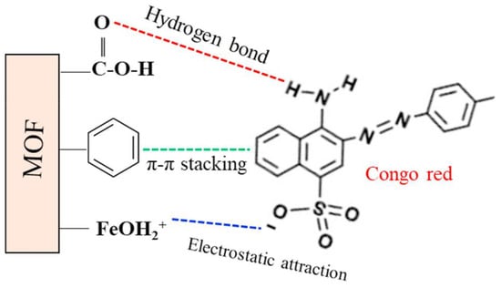 Figure 7 [109] shows the adsorption mechanism of anionic dye (congo red) over cationic MOFs. The adsorption depends on the nature of the charge on the fabricated MOFs. If the MOFs are cationic, anionic dyes will adsorb efficiently on their surfaces and vice versa. MOFs have a positive charge on their network that easily attracts anionic dyes. Thus, such electrostatic interaction is dominant in MOFs for dye adsorption. π–π interaction, hydrogen bonding, ion exchange, Lewis acid–base interaction, and physical adsorption are other interactions responsible for dye adsorption over MOFs [121,122,123].