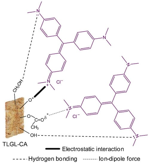 True and comprehensive biosorption mechanisms are still incompletely comprehended, but many researchers have tried their best to explain these mechanisms to some extent. They explained that two types of adsorption (chemisorption and physio-adsorption mechanisms) occur during this process. In chemisorption, mechanisms mainly include electrostatic interaction, ionic exchange, chemical precipitation, and complexes of functional groups (–RO, –COO, R–COOH, and –ROH) present on the biosorbent outer surface interacting with dye molecules and other organic pollutants. The physio-adsorption mechanism comprises the interaction between dye molecules and biosorbents through Van der Waals forces. It is stated that physical sorption has no vital and essential role in the biosorption mechanism, but few studies claim that physical sorption has a prominent role in adsorption [135,136]. Figure 8 [130] displays the proposed adsorption mechanism of crystal violet (CV) dyes over lemongrass leaf fibers incorporated with cellulose acetate (TLGL-CA). This mechanism indicated a strong adsorption of crystal violate on the TLGL-CA by electrostatic interaction between the negatively charged groups of TLGL-CA and positively charged quaternary ammonium groups in the CV in the basic medium [137]. Additionally, hydrogen bonding also formed between nitrogen atoms in CV and hydrogen atoms in hydroxyl groups of the TLGL-CA. Dipole forces could also be generated between partially negative charges on oxygen atoms in carbonyl groups of TLGL-CA and positive charges in CV [130]. From the above literature data, it is obvious that biosorbents are a useful candidate for environmental protection in the near future because of its highly friendly, abundant nature and cost-effectiveness.