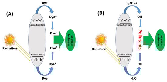 In the first route, photons absorb equal energy or higher energy than the band gap of the respective materials, causing electron excitation from the lower band (valence band) to the higher band (conduction band) of the respective materials; as a result, the formation of pairs of electrons and positive holes occurs [152]. The generated holes and electrons mainly interact with dye molecules and produce excited dye molecules, denoted by dye*. In the next step, excited dye* (unstable dye) is converted to free radicals (anionic dyes (dye−) or cationic dyes (dye+)). In the last step, these generated dye radicals spontaneously degrade because free radicals are highly unstable and need stability, which is the main reason for dye degradation [153]. The above photocatalytic phenomenon is shown in Figure 9.