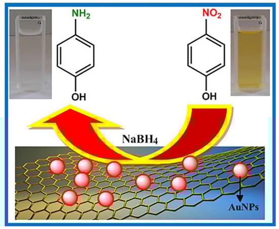 - Vellaichamy, B.; Prakash, P.; Thomas, J. Synthesis of AuNPs@RGO nanosheets for sustainable catalysis toward nitrophenols reduction. Ultrason. Sonochemistry 2018, 48, 362–369. [Google Scholar] [CrossRef]