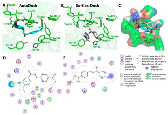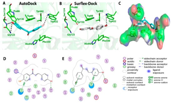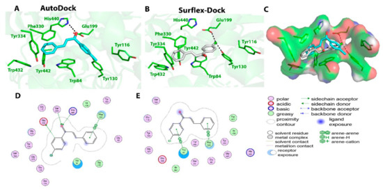 Biochemical interactions (A,B) show the 3D schematic diagrams of compound 10 with AChE enzyme (PDB ID: 3I6M). Black dashed lines refer to the H-bonding interactions, amino acids implicated in H-bond with compound 10 are shown as sticks. Diagrams were obtained using DSV software as docking results of AutoDock and Surflex-Dock programs, respectively; (C) shows the orientation of compound 10 inside the AChE active-site gorge as predicted by AutoDock (blue) and Surflex-Dock (gray) and the electrostatic surface of the AChE gorge. Negative charges are shown in red color, positive charges in blue color, and neutral charges in white color; (D,E) are the 2D schematic diagrams obtained by Molecular Operating Environment software as docking results of AutoDock and Surflex-Dock, respectively representing the polar, acid, basic, and greasy amino acid around compound 10 [35].