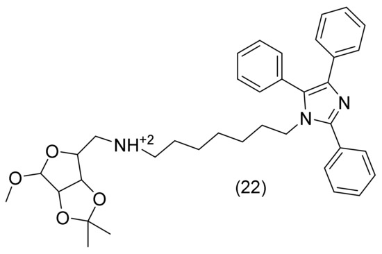 The only potent compound was N1-(1-O-Methyl-5-deoxy-2,3-O-isopropylidene-β-D-ribofuranoside)-5-(N7-(2,4,5-triphenyl-1H-imidazol-1-yl)heptan-1-amine), compound 22 (Figure 18). This compound has the ribose moiety packed between Trp84 and Phe330, in accordance with the glide binding modes, whereas the lophine moiety has one phenyl group packed between Tyr70 and Trp279 from PAS. The linker has a “bend” in the compound binding mode, allowing a second phenyl ring to connect with several aromatic residues in a hydrophobic pocket in the centre of the binding cavity, which is primarily made up by Try121, Phe290, Phe331, and Phe330 [50].