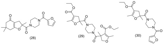 The piperazine moiety can bind to several receptors with great affinity [63]. Numerous biological activity studies have been conducted, including those on antibacterial [64], antiviral [65], and anticancer properties [66]. Additionally, piperazine-containing compounds are appropriate and promising candidates for AD therapy medications because there are numerous reports of piperazine derivatives inhibiting acetylcholinesterase in the literature [67]. In their study, Sari, S. and Yilmaz, M. [68] analyze the AChE inhibition for piperazine derivatives compared with the effect of donepezil on AChE. The most active derivatives of piperazine are presented in Figure 21. The aromatic groups of His447 and Trp86 interact with by the donepezil N-benzyl moiety through π-π interactions. Moreover, the aromatic moieties of Tyr341, Tyr337, and Phe338 interact with the piperidine ring through π-alkyl and π-π interactions. Additionally, Phe295 and carbonyl oxygen interact as usual through a C-H bond. Through π-π and π-σ bond interactions, Trp286 communicates with the benzene and methoxy groups, respectively. Similar to this, Tyr341 establishes π-π and π-σ interactions with the CH2 group and benzene, respectively. It can be demonstrated by examining the interactions between the top docking motif of the first drug and AChE that dimedone methyl interact through π-alkyl bonds with the aromatic groups of His447 at the catalytic triad and Trp86 at the anionic site, similarly to donepezil. Furthermore, the methyl and piperazine rings of dihydrofuran engage via π-alkyl interactions with Tyr341 and Tyr124 at the peripheral anionic site of AChE. Last but not least, the aromatic furan ring interacts (π-π interaction) with Tyr341 [68]. By examining the interactions of the piperazine-dihydrofuran compound 29 (Figure 21) carrying a carbethoxy group, it was found that the amide carbonyl reacts with Phe295 in a way that is comparable to the donepezil carbonyl moiety. Similarly, the dihydrofuran ring’s methyl interacts with the Trp286, Tyr124, and Tyr341 residues in the outer anionic site via π-alkyl linkages. The other methyl group on dihydrofuran interacts with Phe297 and Phe338 at the acyl pocket via π-alkyl interactions, while its ester group interacts with His287 using a typical C-H contact [68]. For derivative 30 (Figure 21) being the most effective inhibitor, ligand-protein interactions showed that Trp286 interacts with both methyl moieties via π-σ and π-alkyl interactions. Additionally, Tyr341, Tyr124, Phe297, and Phe338—form -alky interactions with two dihydrofuran methyls. In addition, the piperazine ring interacts in a way that is comparable to the piperidine ring of donepezil with Phe338 and Tyr337. Furthermore, a π-π interaction between the furan ring and Trp86 occurs. The most effective inhibitors in this work exhibit similar modes of action to the standard medicine donepezil when ligand-protein interactions are considered, and the docking results support the in vitro experimental findings [68].