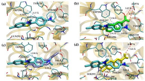 Isoniazid is a well-known anti-tuberculosis medication, and the hydrazones that are produced from it are well-known iron chelators. Some chelators, such as clioquinol, are referred to be MPAC because it is believed that they trigger metal release from peptides and the restart of the clearance of β-amyloid [58]. Clioquinol use, however, results in unfavorable side effects [59]. A MPAC has recently been an isonicotinoyl hydrazone of 8-hydroxyquinoline-2-carboxaldehyde. The chemical class of acyl-hydrazones is in fact a potential category of MPACs for the treatment of Alzheimer’s disease, as the same research team affirmed in a subsequent article [60]. Τhis prompted Santos’s D.C. researchers to synthesize hybrid acylhydrazones as isoniazid derivatives. π stacking of the 3-chromonyl nucleus with residues Tyr341, Phe297, and Trp286 (PAS), as well as hydrogen bonding involving the ether oxygen of the 3-chromonyl nucleus and the oxygen atom of the carbonyl group of the acylhydrazone moiety with Ser293 and Phe295 are important interactions of the most active (compound 27, Figure 20) exhibited with AChE. The peripheral anionic site (PAS) (Tyr74, Tyr124, Trp286 and Tyr341), the catalytic site (Ser203, His447 and Glu334), and the anionic site are all present in the active site of AChE. (Trp86, Tyr133, Tyr337, and Phe338) [61]. In a recent study, the virtual screening of many compounds with anticholinesterase activity revealed that Ser203, Gly122, Tyr124, Tyr72, and Phe337 hydrogen bonds are the most frequently found interactions, as well as π-stacking interactions with the indole ring of Trp286 [62].