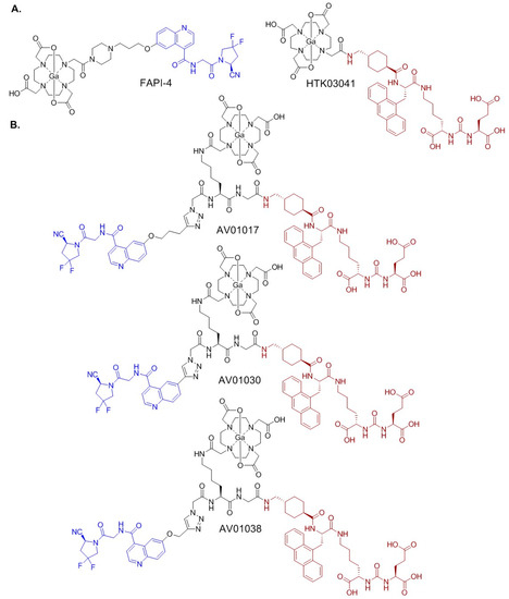 Chemical structures of (A) PSMA-targeting [68Ga]Ga-HTK03041 and FAP-targeting [68Ga]Ga-HTK03041; and (B) bispecific PSMA/FAP-targeting 68Ga-labeled AV01017, AV01030, and AV01038. The PSMA- and FAP-targeting pharmacophores are shown in brown and blue, respectively.