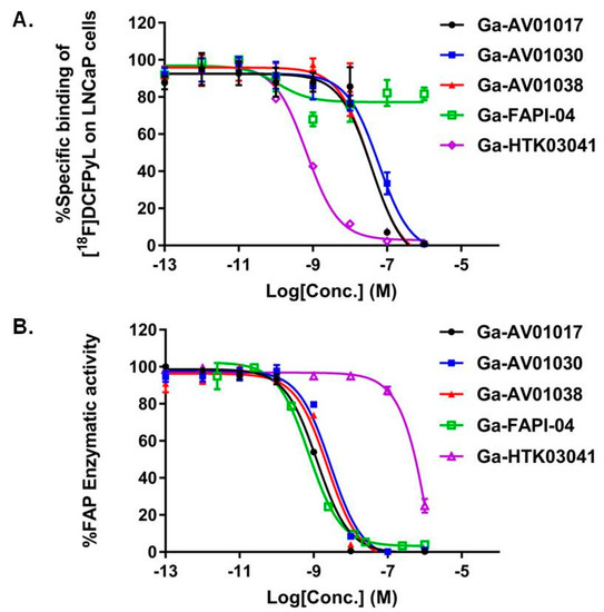 (A) Displacement curves of [18F]DCFPyL by Ga-AV01017, Ga-AV01030, Ga-AV01038, Ga-FAPI-04, and Ga-HTK03041 generated using PSMA-expressing LNCaP cells; (B) Fluorescence curve of FAP enzymatic activity on Suc-Gly-Pro-AMC substrate with inhibition by Ga-AV01017, Ga-AV01030, Ga-AV01038, Ga-FAPI-04, and Ga-HTK03041.