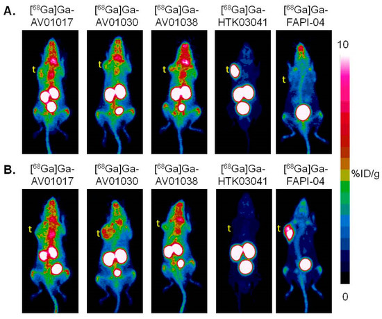 Representative maximum intensity projection PET images of [68Ga]Ga-AV01017, [68Ga]Ga-AV01030, [68Ga]Ga-AV01038, [68Ga]Ga-HTK03041, and [68Ga]Ga-FAPI-04 acquired at 1 h post-injection in mice bearing (A) LNCaP tumor xenografts and (B) HEK293T:hFAP tumor xenografts. t: tumor.