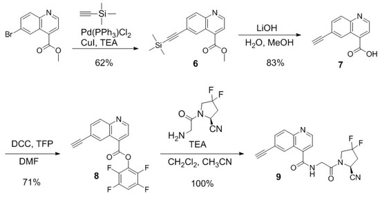 The synthesis of compounds 5, 9, and 13 are depicted in Scheme 1, Scheme 2 and Scheme 3, respectively, and detailed synthetic procedures and characterizations for the final products and intermediates are provided in the Supplementary Materials. For the preparation of compound 5 (Scheme 1), quininic acid was demethylated in 48% HBr solution, followed by esterification in methanol in the presence of thionyl chloride to obtain 1 in 47% yield. Mitsunobu coupling between compound 1 and 4-pentyn-1-ol resulted in 2 in 100% yield. Compound 3 was obtained in 74% yield by the hydrolysis of 2 with NaOH in a mixture of water and methanol. Esterification of compound 3 with tetrafluorphenol (TFP) led to compound 4 in 72% yield. Compound 5 was obtained in 97% yield by coupling the activated ester 4 with (S)-1-(2-aminoacetyl)-4,4-difluoropyrrolidine-2-carbonitrile.