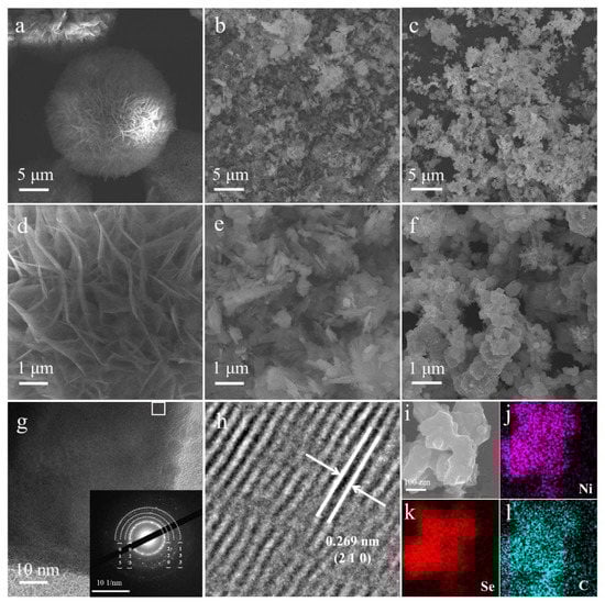 The Ni-MOFs nanomaterials were first synthesized by a simple one-pot hydrothermal process. As shown in Figure 1a, the pristine Ni-MOFs nanomaterials own a cluster structure stacked with numerous layered sheets, and the self-assembled nanosheets can be better observed in the high magnification SEM images (Figure 1d). Based on the above synthesis process, NiSe2−X nanomaterials with different degrees of selenization can be obtained by adding different masses of SeO2 into the precursor solution of Ni-MOFs synthesis. Figure 1b–c and Figure S1 show the variation of the structure of NiSe2 nanosheets under different SeO2 addition conditions. It can be seen that NiSe2−0.5 still retains part of the original nanosheets due to the lack of SeO2 during the synthesis process. Meanwhile, in Figure 1f, the homogeneous growth and accumulation of thick nanosheets of NiSe2−1 can be observed. Through the high magnification SEM images of the corresponding area (Figure 1e, f and Figure S1b), it can be clearly observed that the thickness of nanosheets increased with the increased concentration of SeO2. Figure 1i–l shows the EDS images of NiSe2−1 nanomaterials, which indicates that Ni, Se, and C elements are uniformly distributed in the sample. In order to further explore the microstructure of Ni-MOFs and NiSe2-1 nanomaterials, we utilized TEM (Figure 1g and Figure S2). Figure 1g shows that the NiSe2-1 nanomaterials consisted of the square-shaped nanosheets. The inset picture in Figure 1g shows the corresponding selected area electron diffraction (SAED) pattern indicating the typical polycrystalline structure of NiSe2−1. The lattice fringes of the NiSe2−1 material were visible in Figure 1h, where the characteristic lattice spacing (0.269 nm) of NiSe2−1 was consistent with the (210) lattice plane of NiSe2 (JCPDS NO. 41-1495) [35].