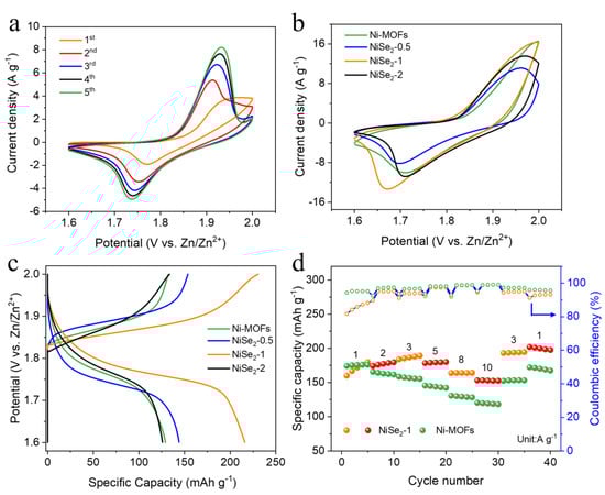 In order to evaluate the electrochemical performance of the prepared electrode materials, we assembled Ni-MOFs, NiSe2−X and Zinc plate into aqueous Ni-Zn batteries. Figure 3a shows different cyclic voltammetry (CV) curves of NiSe2-1 in the initial five cycles. It can be clearly observed that the current response signal increases with the number of scans, indicating the improvement of its electrochemical performance. This phenomenon can be attributed to the continuous activation of the electrode as a result of the surface chemical reaction between NiSe2−1 and KOH electrolyte [39,40]. Figure 3b shows the CV curves of the fabricated batteries with the working window from 1.6-2.0 V, which exhibit typical battery behavior with obvious redox peaks. As illustrated in Figure 3c, the NiSe2−1 displays the highest specific capacity, while the GCD curves of the as-prepared Ni-MOFs and NiSe2−X samples are at the same current density (3 A g−1). The corresponding GCD curves of NiSe2-1 at different current densities are depicted in Figure S4, and it can be clearly seen that the discharge specific capacity reached a remarkable 231.6 mAh g−1 at 1 A g−1, and the discharge specific capacity was still maintained at 162.8 mAh g−1 with a high current density of 10 A g−1, proving its excellent rate performance. Meanwhile, the obvious charge/discharge voltage plateaus appear in the GCD curves at different current densities, and the voltage range of the plateau (at 1.85–1.95 V) matches the position of the redox peaks in the cyclic voltammetry curves correspondingly. This result further confirms that the NiSe2-1 electrode undergoes a redox reaction, which has the typical characteristics of a battery-type material. The rate performance of the original Ni-MOFs and NiSe2−1 electrodes applied to Ni-Zn batteries is shown in Figure 3d. It is noteworthy that the NiSe2−1 exhibits an apparent increase in specific capacity during the initial cycles, which follows the same trend as that in Figure 3a. Both rate capability curves can illustrate that there is no significant decay after the rate cycling due to the good rate capability of Ni-based materials [23]. However, when the current density falls back to 1 A g−1 after 40 cycles, the average capacity retention of the NiSe2−1 electrode can even reach 117% compared to the initial average capacity, which is better than that of the Ni-MOFs electrode (96%) [41].