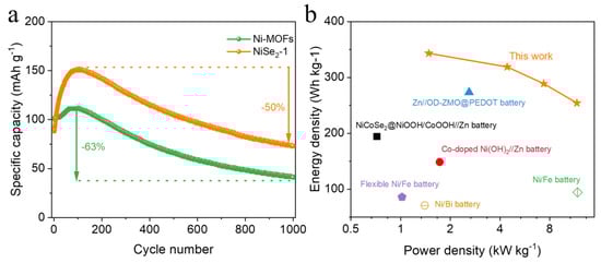 In order to further explore the practicability of the Ni-Zn batteries prepared, we investigated the cycle performance, energy density, and power density. Figure 5a displays the comparison of the long cycle performance of Ni-MOFs and NiSe2−1 as the cathode electrode of Ni-Zn batteries. It can be seen that the specific capacity of Ni-MOFs is slightly higher than that of NiSe2−1 during the very initial cycles, corresponding to the initial rate capability curve in Figure 3e. However, it is worth noting that the specific capacity of NiSe2−1 has a rather high percentage increase compared to the pristine Ni-MOFs, and the increase in capacity over about 100 cycles is attributed to the surface chemistry between NiSe2−1 and the KOH electrolyte, which activates the electrode [39,40]. After reaching the peak specific capacity value, both materials began to decay slowly, and after 1000 cycles, NiSe2-1 decayed by 50% of the peak capacity (Ni-MOFs, 61%), as shown within Figure 5a. Additionally, based on the GCD curves, the energy density and power density of the NiSe2−1//Zn battery were calculated to obtain the Ragone plots (Figure 5b). Noteworthily, the NiSe2−1//Zn battery obtained a maximum energy density of 343.2 Wh kg−1 and a peak power density of 11.7 kW kg−1, which is superior to most of the previously reported rechargeable batteries, including Ni//Bi battery (1.4 kW kg−1, 70.9 Wh kg−1) [9], Zn//OD-ZMO@PEDOT battery (273.4 Wh kg−1, 2.6 kW kg−1) [21], NiCoSe2@NiOOH/CoOOH//Zn battery (0.72 kW kg−1, 194.2 Wh kg−1) [33], Co-doped Ni(OH)2//Zn battery (1.725 kW kg−1, 148.54 Wh kg−1) [48], Ni//Fe battery (11.8 kW kg−1, 94.5 Wh kg−1) [49] and flexible Ni/Fe battery (1.02 kW kg−1, 85.8 Wh kg−1) [50].