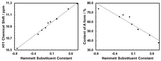 Correlation between the Hammett substituent constant and the H NMR chemical shifts for H11 A form (left, R = 0.99) and content of A (right panel, R = 0.91).