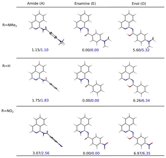 Figure 4 presents the PCM-optimized lowest-energy structures for the tautomers of the three derivatives: the unsubstituted and the two bearing the strongest electron-donating and the strongest electron-accepting substituent in the analyzed sequence NMe and NO, respectively. The clear preference for the planar enamine tautomer in the continuous solvent model was observed independent of the substituent present in the system when taking into account the relative Gibbs free energy and for plain electronic energy differences as well. The twisted amide tautomer in all these three molecules in PCM was characterized by their relative energy slightly higher than the so-called chemical accuracy. However, equaled 3 kcal/mol at most for the nitro-derivative, indicating that the mixture of these two tautomers should be found in the sample at room temperature. The enol form, exhibiting the relative Gibbs free energy of the order of 5–7 kcal/mol, remained significantly less abundant in the experimental conditions (only trace amounts).